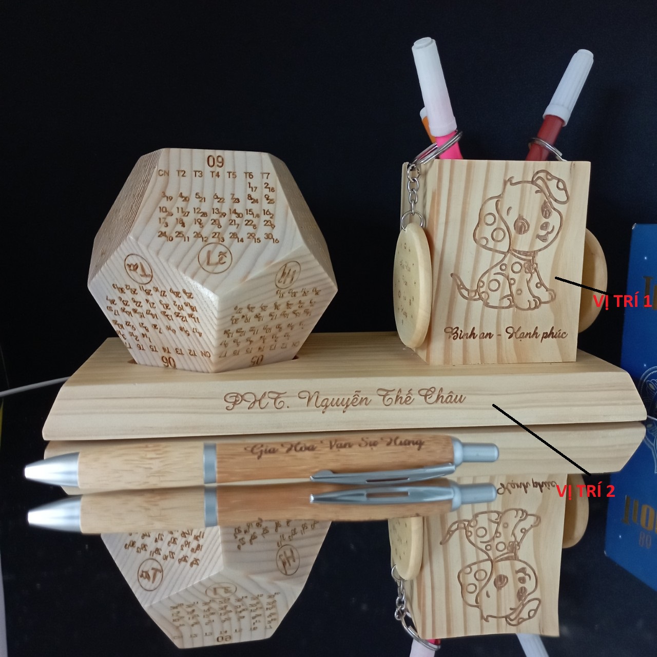 10. Combo lịch gỗ thông nguyên khối khắc chữ và logo, chi pi đơn giản theo yêu cầu