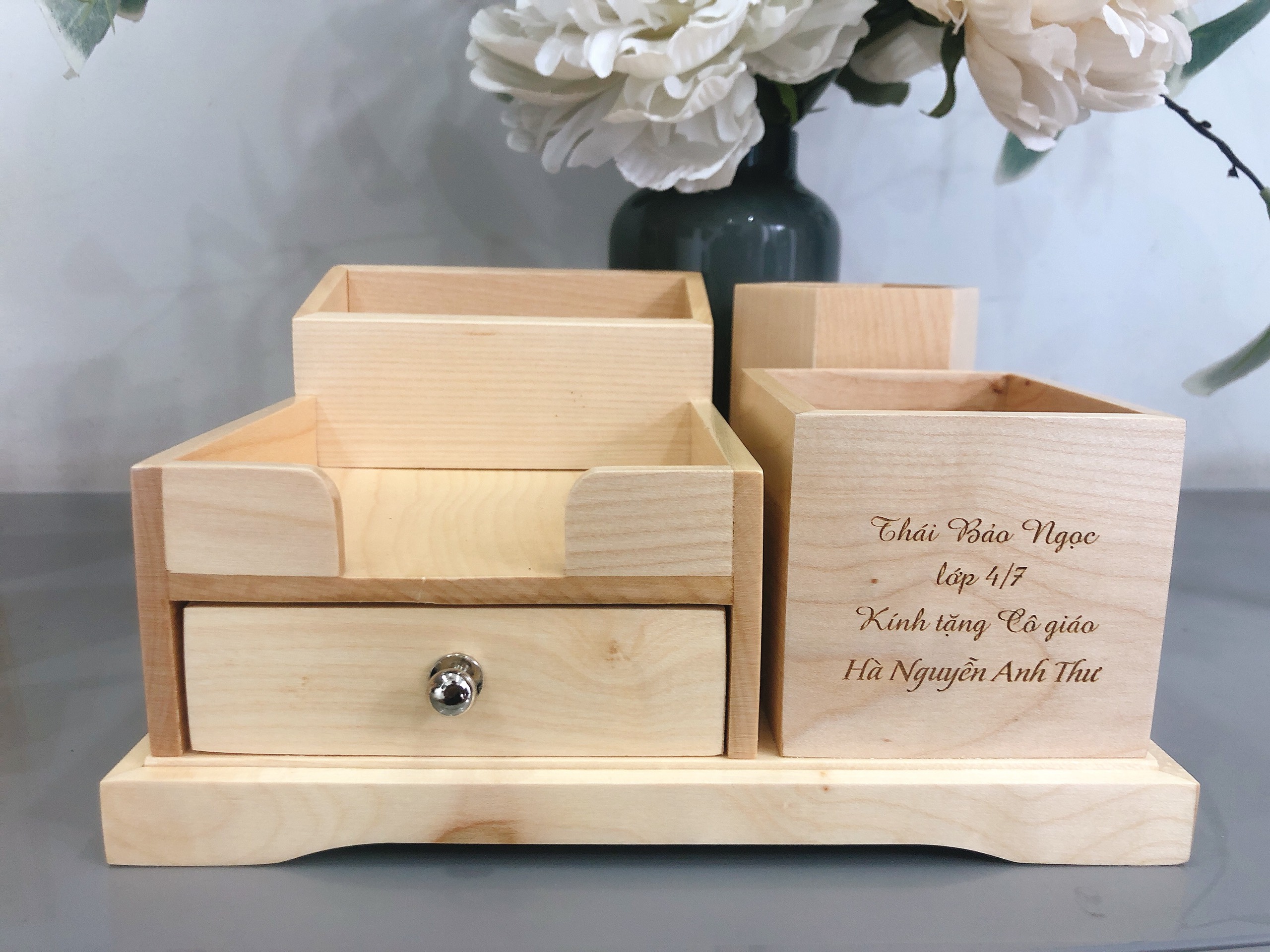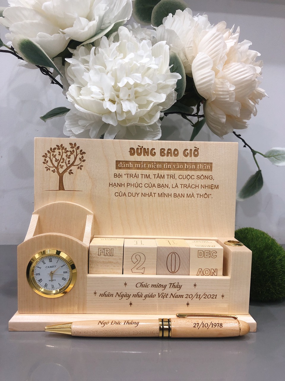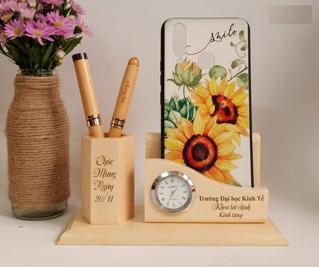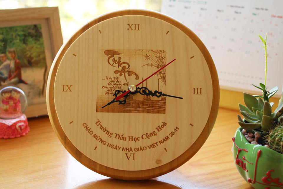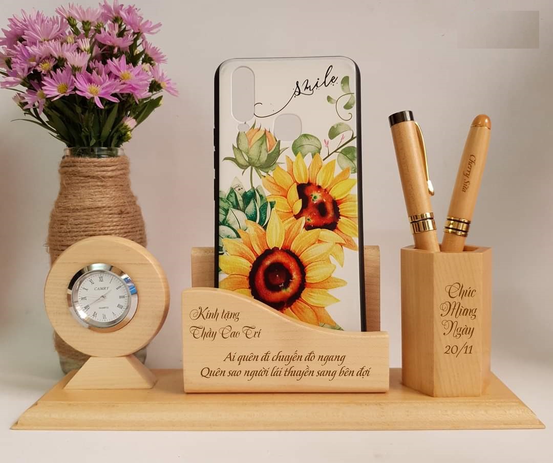 Các thầy cô thường dành nhiều thời gian ngồi vào bàn làm việc của mình. Nếu bạn muốn tìm một món quà để bàn cho thầy cô giáo, có lẽ bạn không thể bỏ qua khung ảnh gỗ đẹp mắt, được làm thủ công tại shop quà tặng gỗ. Ngoài việc giáo viên có thể lồng ảnh lưu niệm của cả lớp hay trường học, khung ảnh gỗ còn có rất nhiều chức năng khác nhau như lịch gỗ vạn niên, khay giữ thẻ hay giấy ghi chú và có chỗ đựng bút viết tiện lợi. Bạn có thể khắc thêm niên khóa để lưu niệm. Đây chắc chắn sẽ là một món quà tuyệt vời sẽ khiến thầy cô nhớ đến lớp mỗi khi sử dụng.