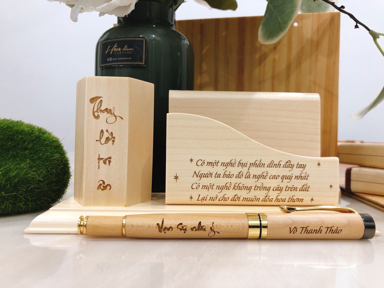 Đối với nhà giáo, bút viết là vật dụng gần như không thể thiếu. Các thầy cô có xu hướng sẽ gắn bó với một chiếc bút ký trong thời gian dài. Vì vậy, Shop quà tặng gỗ Gỗ Mộc Nhân mang đến bạn bộ hộp bút gỗ cao cấp khắc laser hình ảnh, câu chúc, tên ý nghĩa dành cho giáo viên có thể thay ruột khi hết mực. Bút ký bằng gỗ cao cấp đi cùng hộp đựng trang trọng, bạn có thể yêu cầu khắc tên thầy cô của mình lên cả bút và hộp. Bộ bút hoàn hảo để làm quà tặng ngày nhà giáo. Biết đâu đây sẽ là chiếc bút ký yêu thích nhất của thầy cô mà bạn quý mến!
