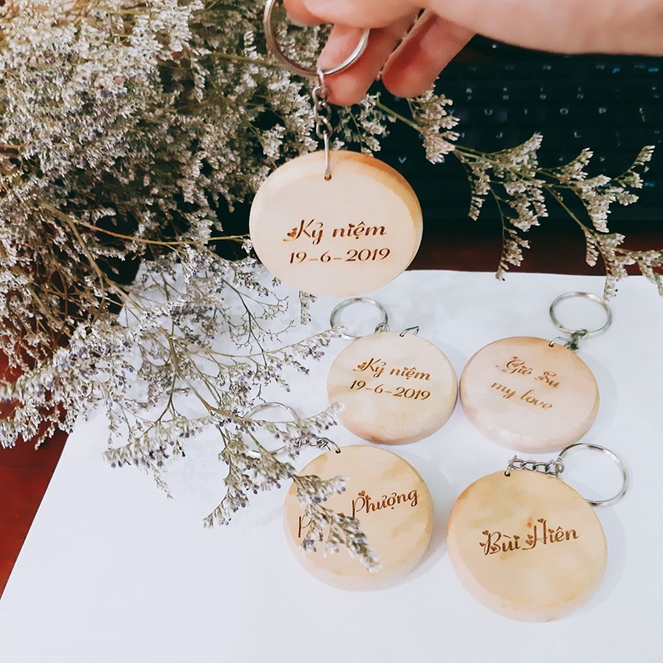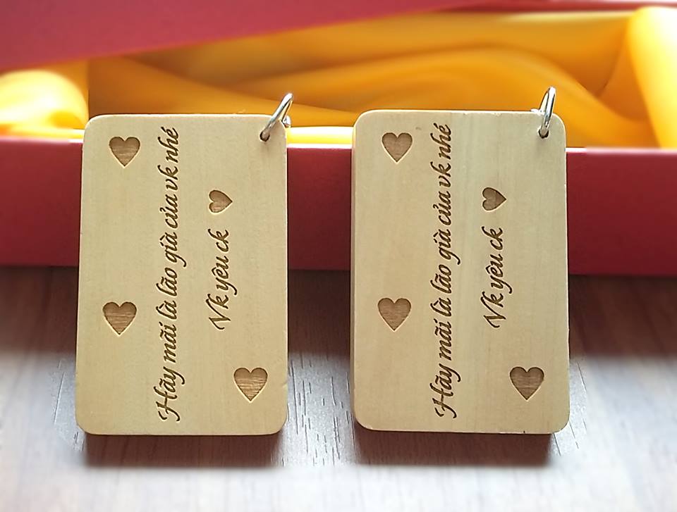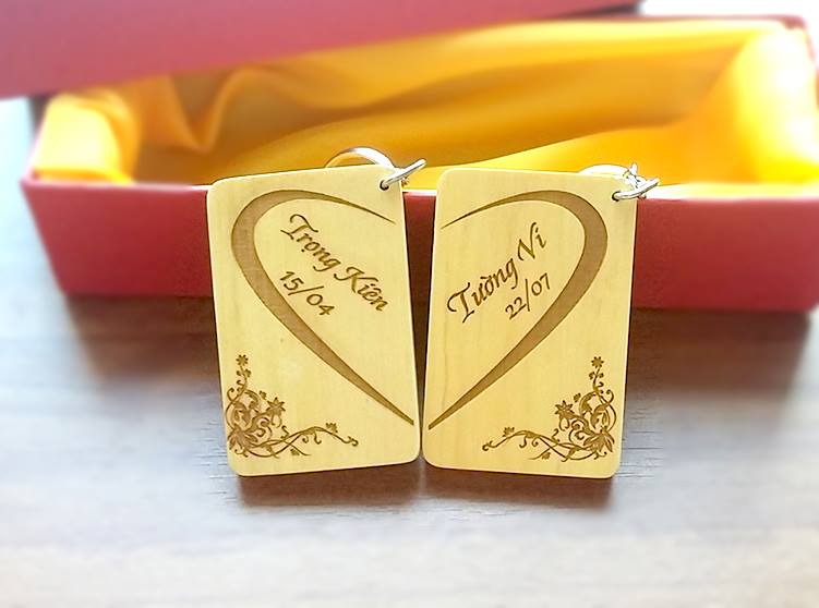 1. Móc khóa gỗ đôi: Một mặt khắc chữ lồng trái tim đẹp và ý nghĩa, và một mặt khắc ảnh theo yêu cầu.