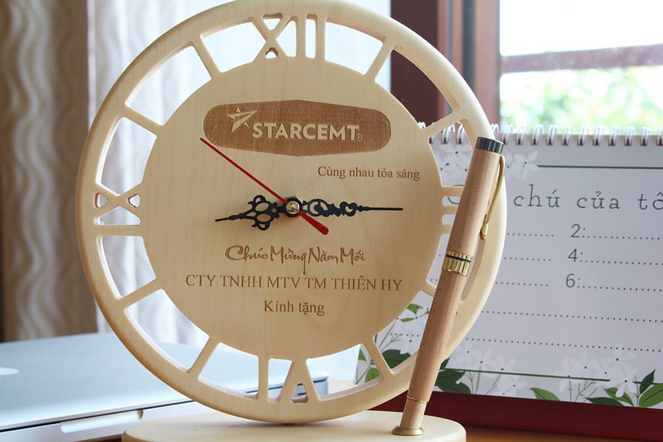 Vậy thì đồng hồ gỗ treo tường khắc logo và lời đề tặng là một sản phẩm rất phù hợp. Bạn có thể yêu cầu chúng tôi khắc nội dung theo ý của bạn.