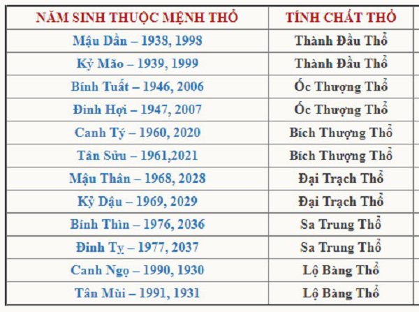Một số năm sinh thuộc mệnh thổ: Mậu dần (1938, 1998), Kỷ Mão (1939, 1999), Bính Tuất (1946, 2006), Đinh hợi (1947, 2007), Canh tý (1960, 2020), Tân sửu (1961, 2021), Mậu Thân (1968), Kỷ Dậu (1969), Bính Thìn (1976), Đinh Tỵ (1977), Canh Ngọ (1990), Tân Mùi (1991),....
