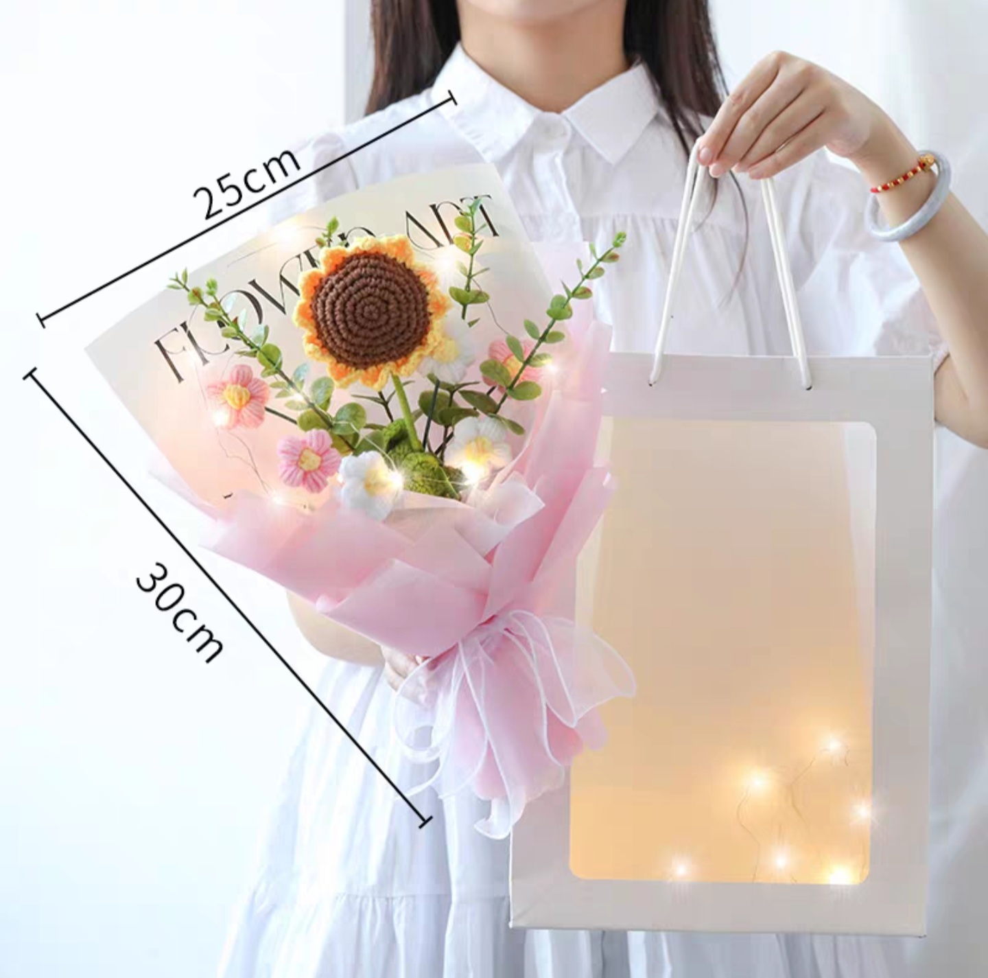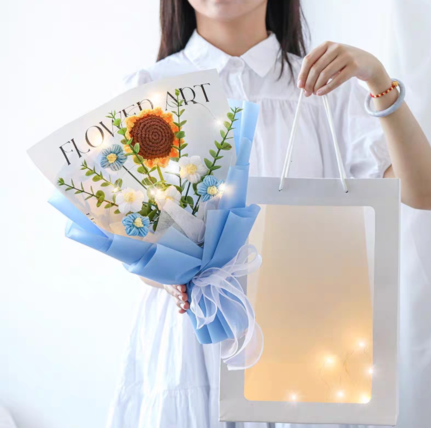 Hoa hướng dương bằng len handmade hòa quyện với hoa hạt bắp 5 cánh dễ thương làm quà tặng cảm ơn ý nghĩa.
