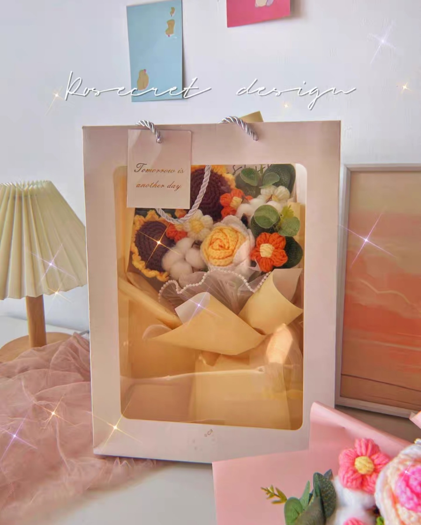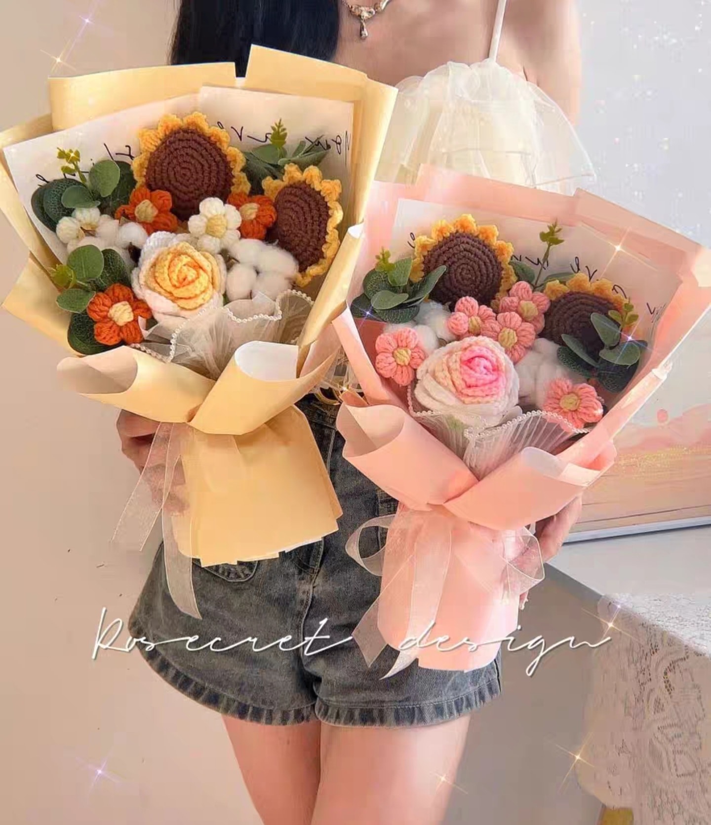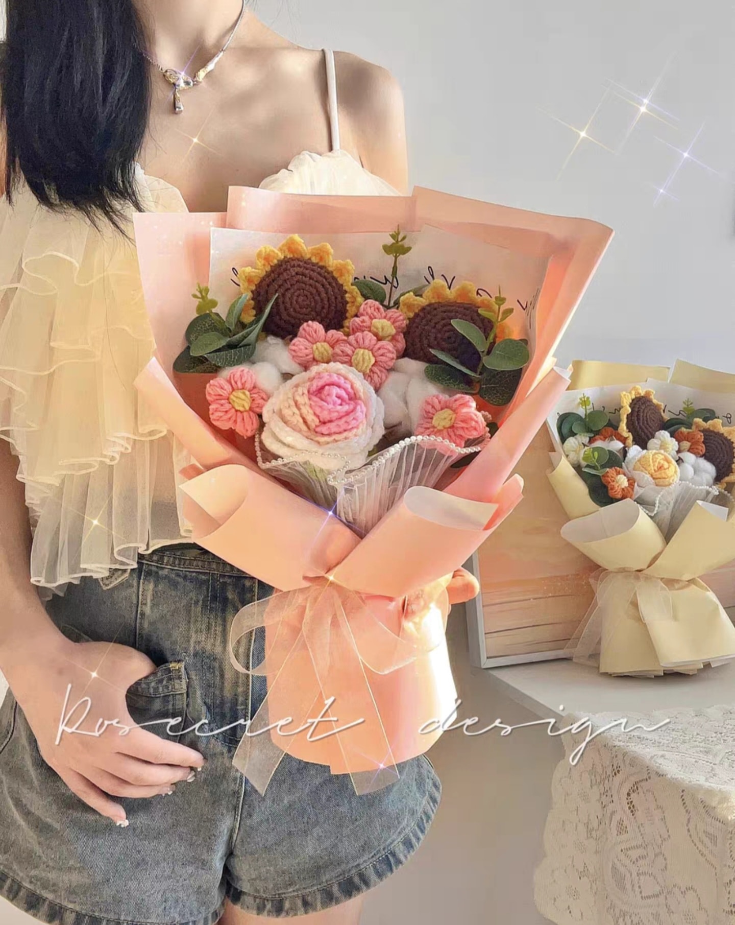 Hoa hướng dương bằng len handmade hòa quyện với hoa hạt bắp 5 cánh dễ thương làm quà tặng cảm ơn ý nghĩa.