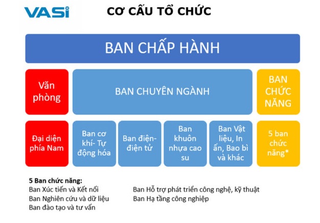 Thành lập tháng 3/2017, Hiệp hội công nghiệp hỗ trợ Việt Nam (VASI) là tổ chức độc lập, phi chính phủ và phi lợi nhuận, đại diện cho doanh nghiệp sản xuất chế tạo và công nghiệp hỗ trợ tại Việt Nam. Các hoạt động của VASI chủ yếu gồm: nâng cao năng lực hội viên qua đào tạo và tư vấn; business matching hội viên với người mua trong nước và xuất khẩu; nghiên cứu khảo sát cung cấp dữ liệu các ngành liên quan; đại diện hội viên đóng góp ý kiến với Chính phủ, các tập đoàn lớn và các đối tác khác.