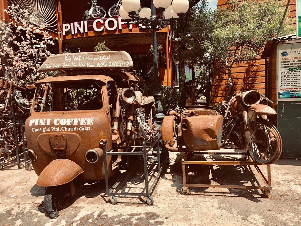 Pini Coffee Đà Lạt là quán cafe nằm cạnh bờ hồ Tuyền Lâm với không gian mới lạ kết hợp cùng một bờ hồ Tuyền Lâm thơ mộng. Đây là điểm đến tuyệt vời cho những ai có tâm hồn lãng mạn và yêu cái đẹp. Khi bước đến đây, mùi cafe chồn sẽ thoang thoảng bay khắp không gian quán. Bạn nên thưởng thức một ly cafe chồn thượng hạng cùng với cách pha chế độc đáo ở đây. Đặc biệt, nơi đây còn trưng bày hàng trăm xe cổ độc đáo. Nơi đây là điểm đến không thể bỏ qua của những người yêu xe.