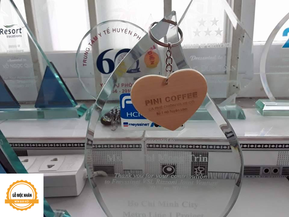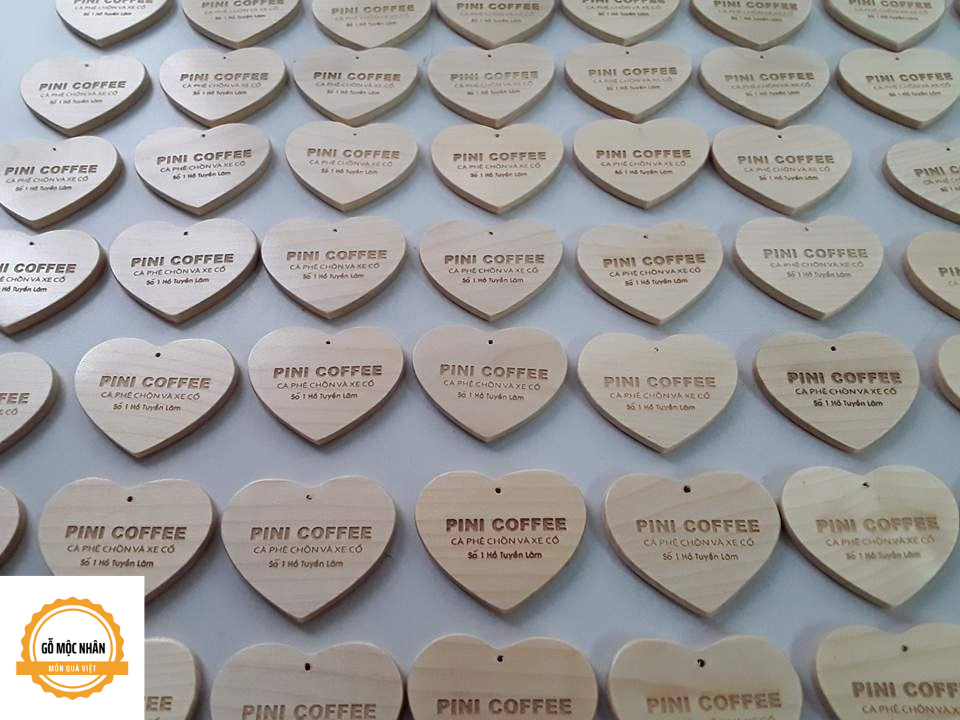 Khách hàng tiêu biểu Pini Coffee Đà Lạt chọn móc khóa gỗ trái tim và mó khóa gỗ hình tròn khắc logo và slogan làm quà tặng sự kiện khai trương tri ân và tặng khách hàng.