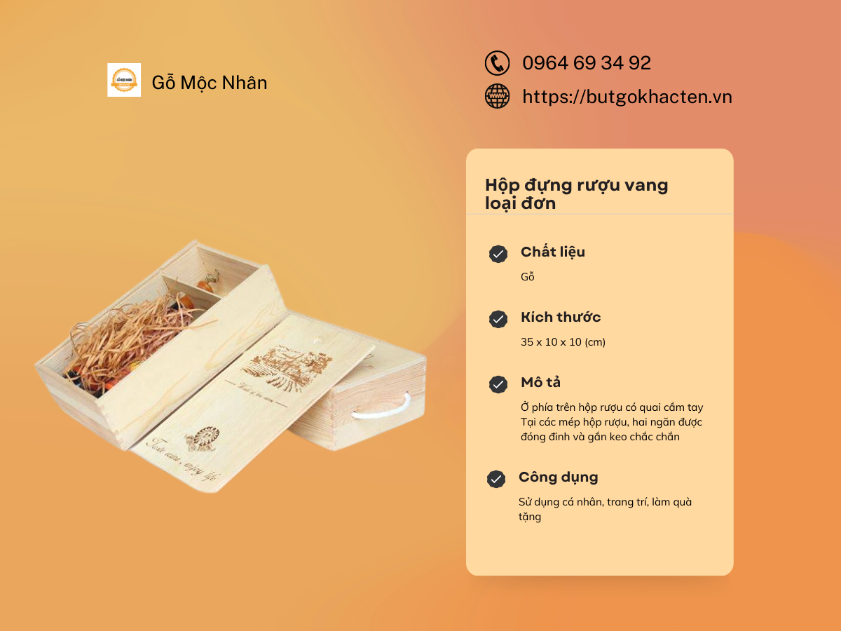 Hộp gỗ đựng rượu vang rất thích hợp để bảo quản và đựng các chai rượu vang 750ml → 810ml. Hộp đựng rượu gỗ sử dụng chất liệu gỗ thông nhẹ, thân thiện và an toàn.