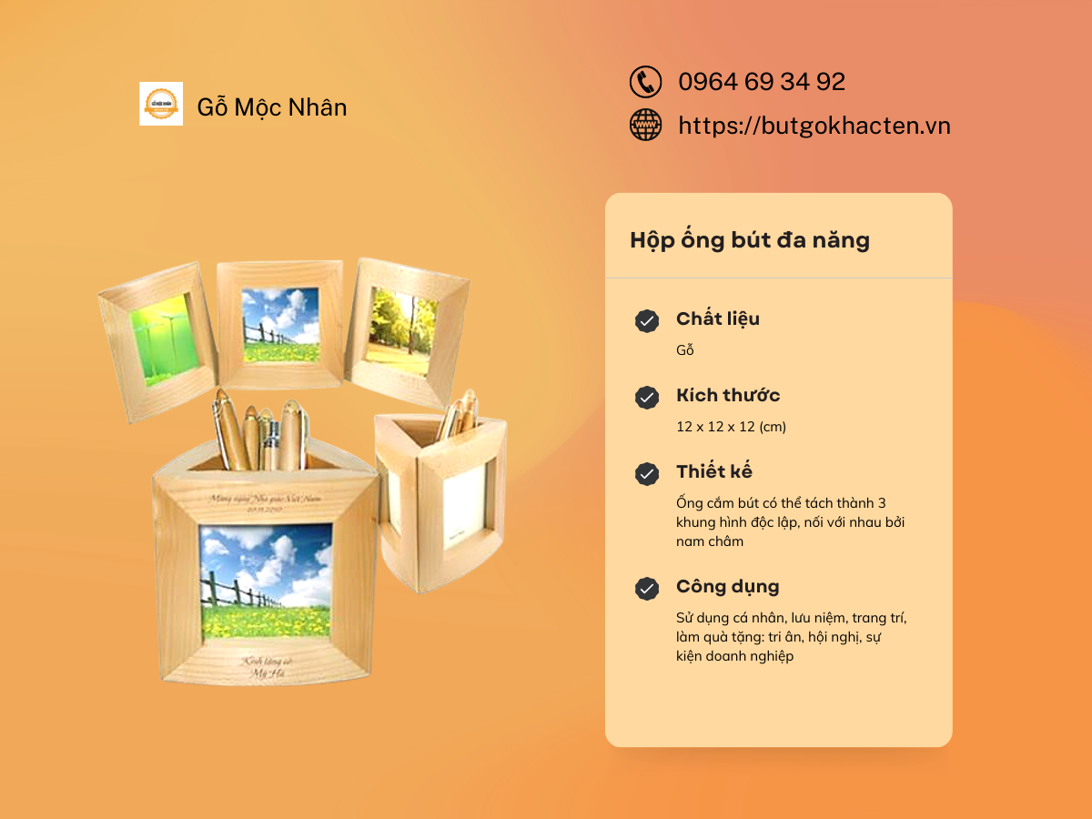 Hộp ống bút khung hình đa năng không chỉ có thiết kế đa dạng, kiểu mẫu tinh tế, đầy sáng tạo, điểm đặc biệt đây là các sản phẩm đều được khắc thông tin cá nhân hóa, đều chứa đựng những thông điệp riêng, những mẫu trang trí riêng đặc sắc. Không hề đơn điệu, khuôn mẫu, mỗi sản phẩm đều là một mẫu thiết kế đẹp mắt và ý nghĩa, phù hợp với từng cá tính riêng của người mua.