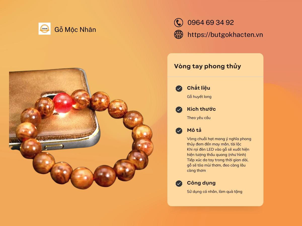 + Thứ 2: Riêng gỗ huyết long, lúc mới hoàn thiện sẽ không có mùi thơm. Khi được tiếp xúc ánh sáng,mồ hôi,hơi người (khoảng 1 tháng) gỗ sẽ tỏa mùi thơm thoang thoảng như trầm,đeo càng lâu càng thơm,gỗ sẽ lên nước sáng hồng rất đẹp. Những loại gỗ có mùi thơm khác,lúc mới chế tác xong gỗ có mùi thơm sau một thời gian sẽ bớt mùi thơm, muốn gỗ có mùi thơm trở lại phải lấy giấy nhám chà gỗ hoặc gọt bỏ đi phần gỗ bên ngoài.