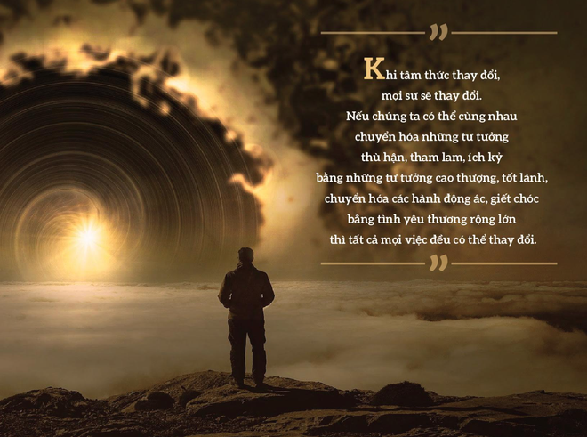 5. Khi tâm thức thay đổi, mọi sự sẽ thay đổi. Nếu chúng ta có thể cùng nhau chuyển hóa những tư tưởng thù hận, tham lam, ích kỷ bằng những tư tưởng cao thượng, tốt lành, chuyển hóa các hành động ác, giết chóc bằng tình yêu thương rộng lớn thì tất cả mọi việc đều có thể thay đổi. Một khi mỗi cá nhân có thể sửa đổi nghiệp quả của mình bằng cách làm việc thiện lành thì một tổ chức hay một quốc gia cũng có thể làm như vậy để chuyển nghiệp và có sự thay đổi tốt đẹp hơn.