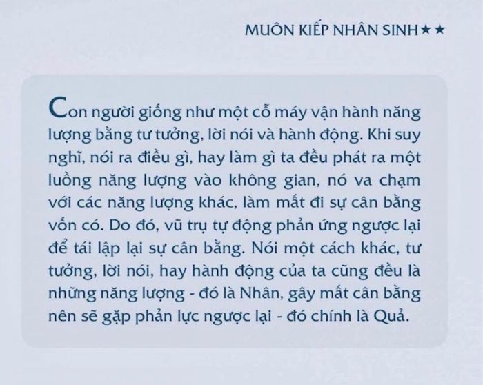 13. “Con người giống như một cỗ máy vận hành năng lượng bằng tư tưởng, lời nói và hành động. Khi suy nghĩ, nói ra điều gì, hay làm gì ta đều phát ra một luồng năng lượng vào không gian, nó va chạm với các năng lượng khác, làm mất đi sự cân bằng vốn có. Do đó Vũ Trụ tự động phản ứng ngược lại để tái lập lại sự cân bằng. Nói một cách khác, tư tưởng, lời nói, hay hành động của ta cũng đều là những năng lượng – đó là Nhân gây mất cân bằng nên sẽ gặp phản lực ngược lại – đó chính là Quả”.