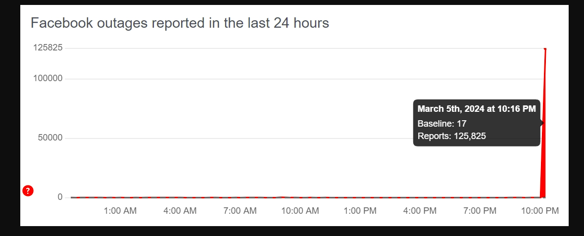 Thống kê từ Down Detector cho thấy, hàng loạt người dùng trên toàn thế giới đều báo cáo về sự cố không thể truy cập Facebook. Tính tới thời điểm 10 giờ 34 phút tối 5/3, có tới hơn 125.000 lượt báo cáo về lỗi Facebook bị sập.