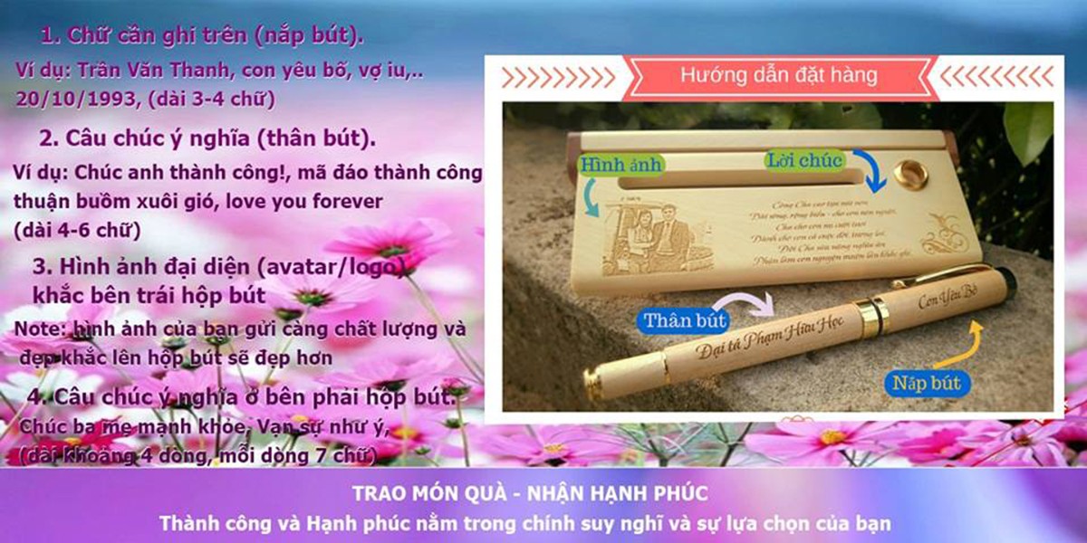 Note: Hình ảnh của bạn gửi càng chất lượng và đẹp khắc lên hộp bút sẽ đẹp hơn. 4, Câu chúc ý nghĩa ở bên phải hộp bút. Ví dụ: Vạn Sự Như Ý, Chúc ba mẹ luôn mạnh khỏe!! ...(dài khoảng 4 dòng, mỗi dòng 7 chữ ) Bạn hãy liên hệ với mình qua facebook Bút Gỗ Khắc Tên để được tư vấn rõ hơn hoặc hotline 0377.78.92.45